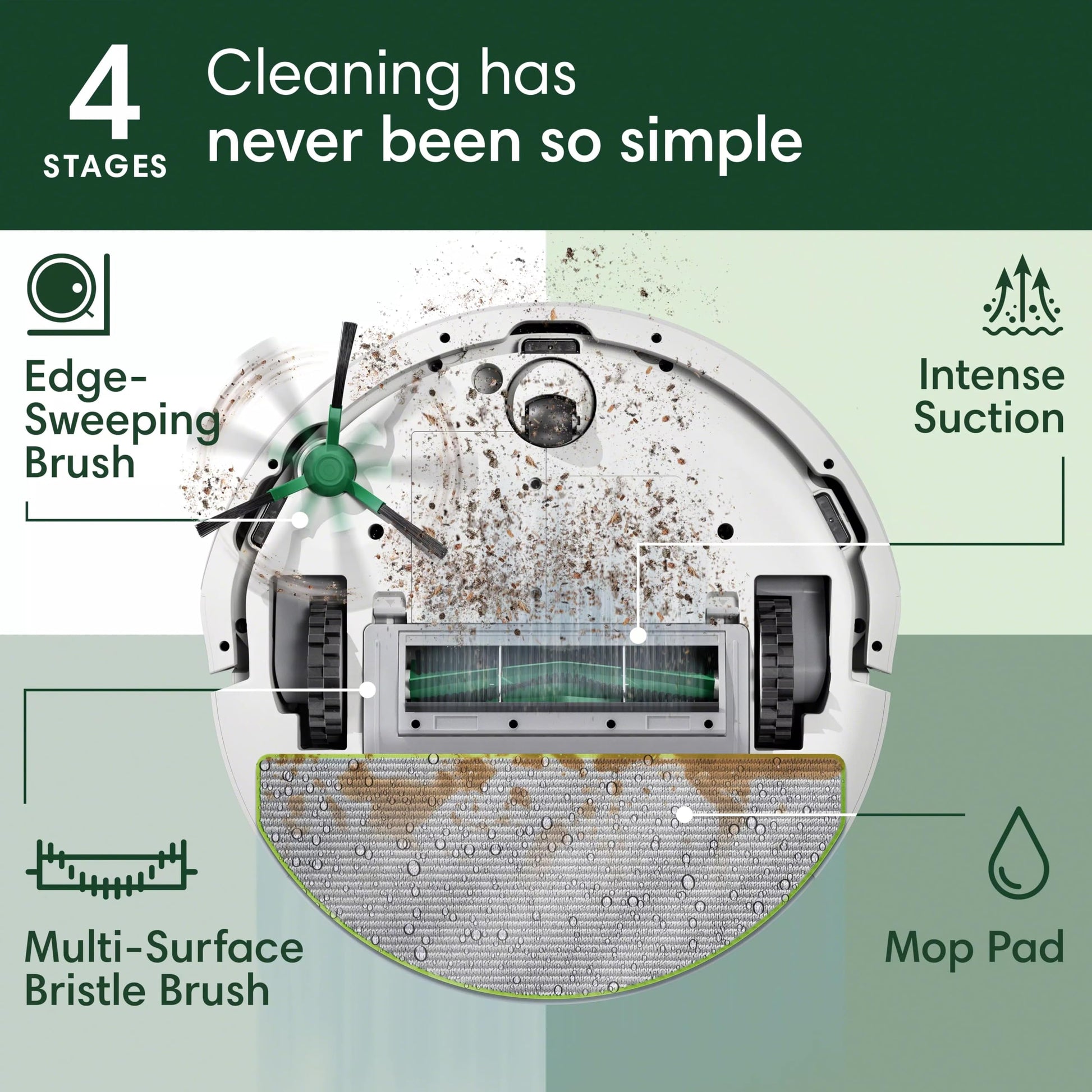 • Dirt and debris - gone! 4-Stage Cleaning includes 70X more power-lifting suction*, a Multi-Surface bristle brush, and Edge-Sweeping brush to devour dirt and dust bunnies, plus a microfiber mop pad to leave floors shiny and clean. *As compared to Roomba 600 series robots