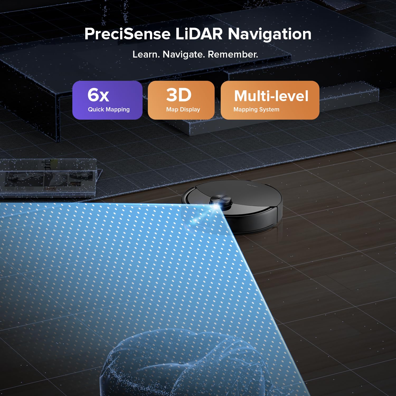 - PreciSense LiDAR Navigation - The LiDAR-based system scans 360° to create highly detailed 3D maps and supports multi-level mapping for efficient navigation across different floors. Enjoy precise route planning for quick, accurate, and thorough cleaning in every corner of your home