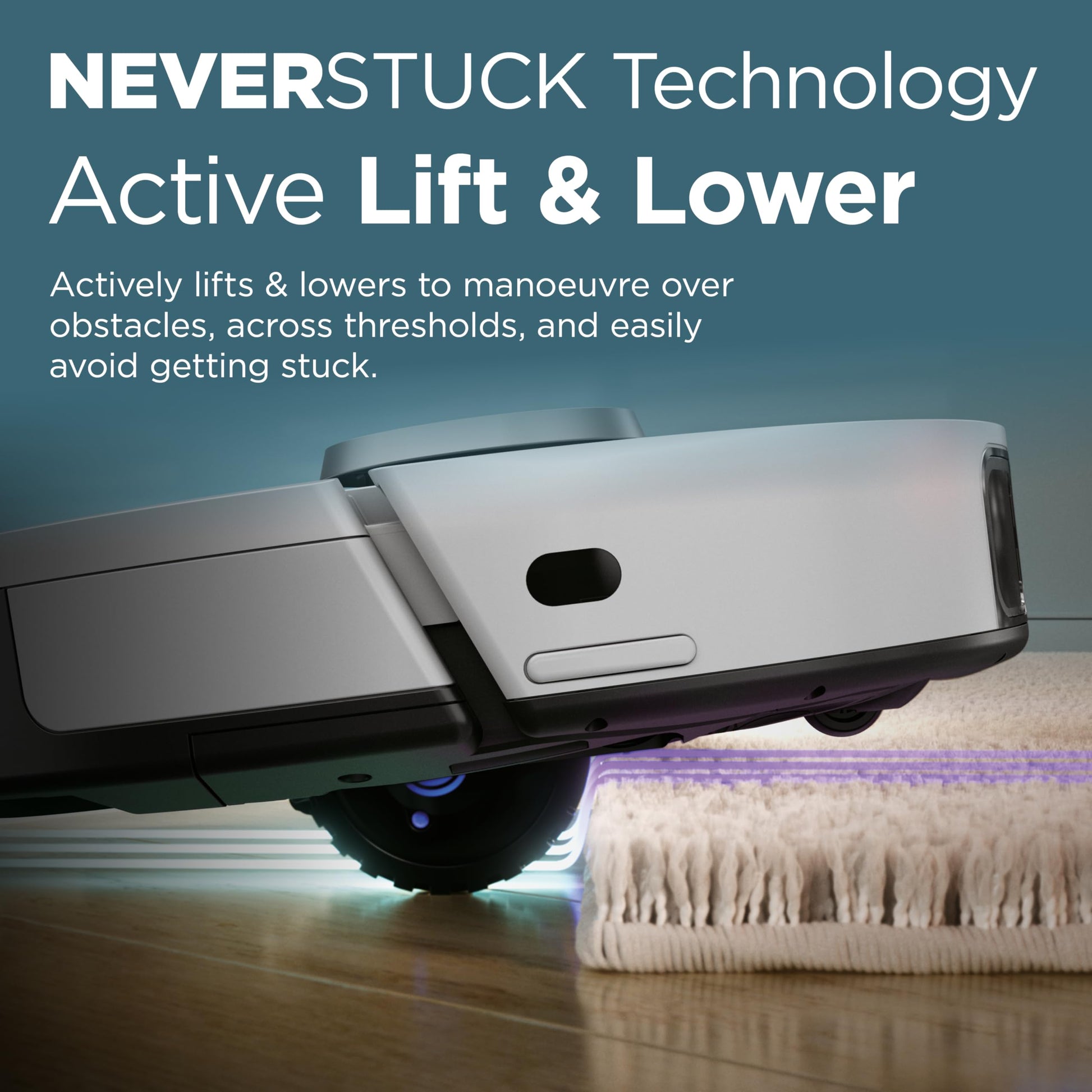 - Enhanced cleaning coverage with NeverStuck Technology: Lifts and lowers the device over thresholds, obstacles, bumps, thick carpets and more